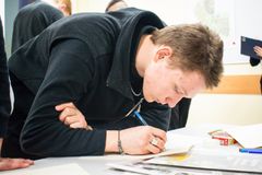 Конкурсная стипендиальная программа разбита на этапы, включающие в себя домашнее задание, тренинг и собеседование. В качестве домашнего задания необходимо было представить логотип компании из подручных материалов. Студенты из группы С21к воспользовались картоном, клеем и краской, группа С04 использовала конструктор Лего, С31к собрала логотип из отдельных кирпичей, отдельно стоит отметить задумку и реализацию задания группой С03, когда в отдельных домах загораются окна К, С и М.
