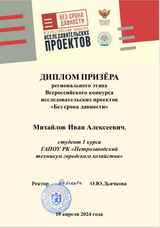 Студенты первого курса, обучающиеся по специальности «Строительство и эксплуатация зданий и сооружений», Ефремова Ульяна и Михайлов Иван под руководством преподавателя истории Илоны Геннадьевны Васюта представили свою работу в номинации «Отражение геноцида в архивных документах, представленных на сайте проекта «Без срока давности» (безсрокадавности.рф)». Было проведено исследование по теме «Отражение геноцида в воспоминаниях узников финских концлагерей города Петрозаводска».