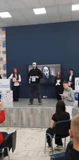 Отдельно хотелось бы отметить одно из заданий, в котором студенты должны были проявить свою креативность. Командам предлагалось подготовить костюм известного героя художественного фильма и представить его на английском языке. Наша команда выбрала героя Ghostface (Призрачное лицо) из франшизы «Крик» («Scream»).