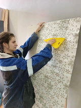 Конкурсное задание этого года состоит из двух модулей, работа над которыми займет 3,5 часа. За это время участникам предстоит подобрать рисунок и поклеить виниловые обои, покрасить и приклеить молдинг, выполнить декоративную отделку и перенести изображение с использованием трафарета.