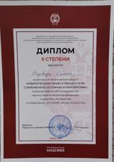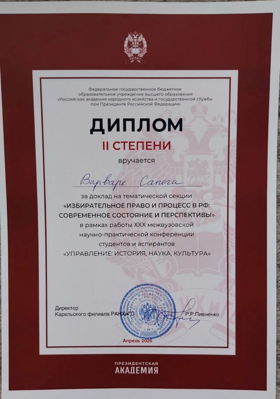 Сапега Варвара выступала в секции «Избирательное право и процесс в РФ», где представила исследование на тему: «Электоральный абсентеизм в Российской Федерации: причины, последствия, пути преодоления» на площадке Законодательного Собрания Республики Карелия и заняла 2-е место, получив Диплом II степени.