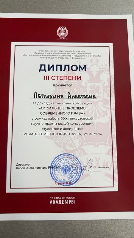 Лепилина Анастасия защищала свою исследовательскую работу «Опыт работы с многодетной семьей в Республике Карелия: понятие, особенности и проблемы законодательства» на площадке Карельского филиала РАНХиГС и заняла 3-е место, получив Диплом III степени.